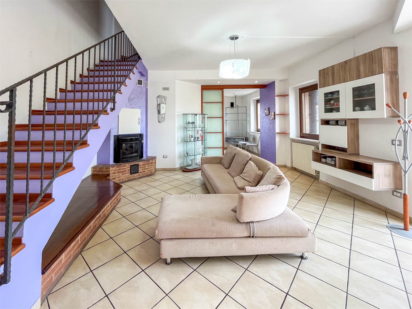 Zona giorno: Al piano terra troviamo un luminoso salotto con camino, una cucina abitabile, un bagno di servizio e una scala che conduce al piano superiore. Grandi finestre e portefinestre permettono l'accesso diretto al giardino, regalando luce naturale e continuità con l'esterno.