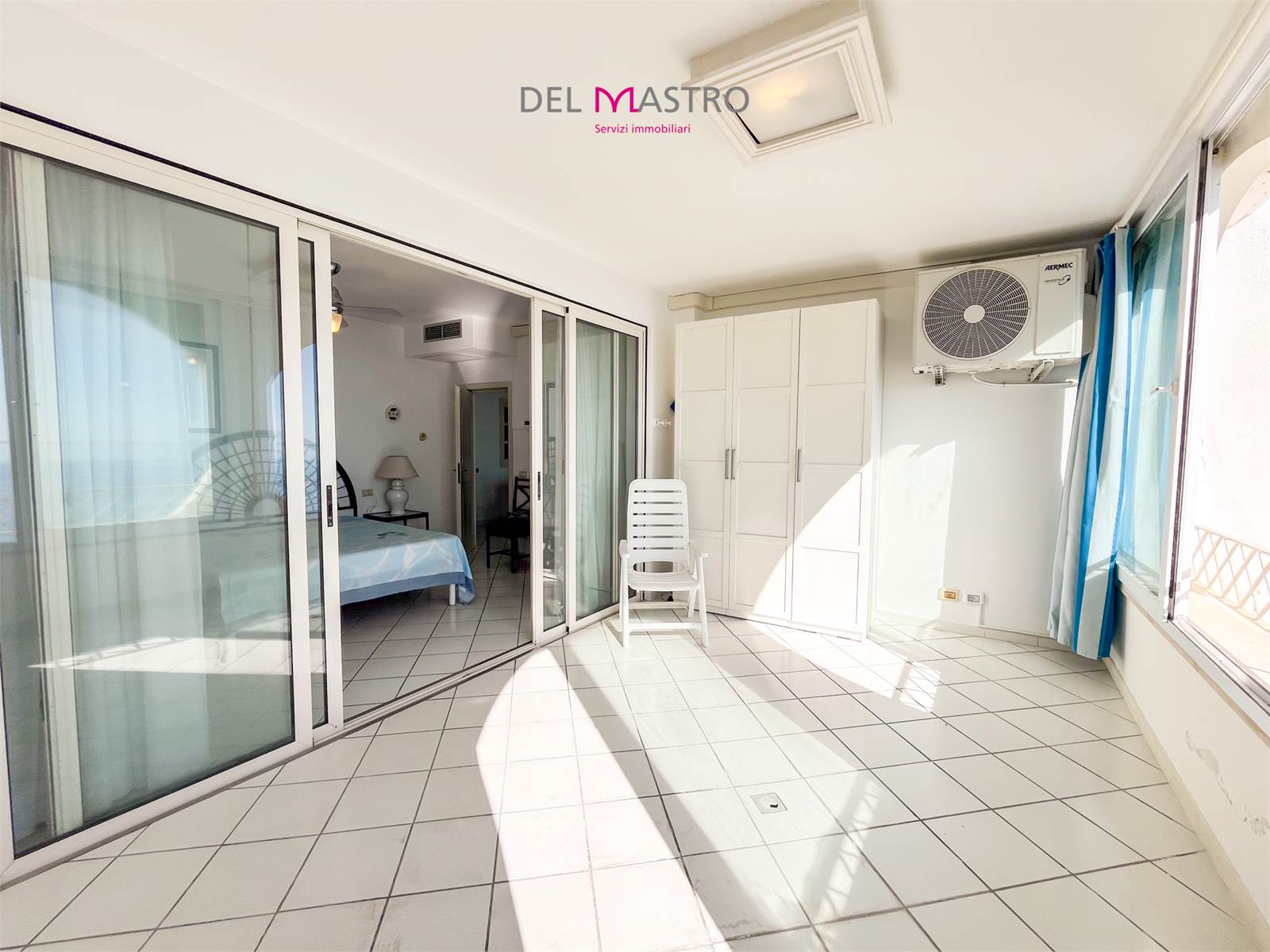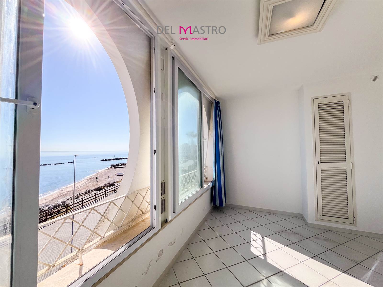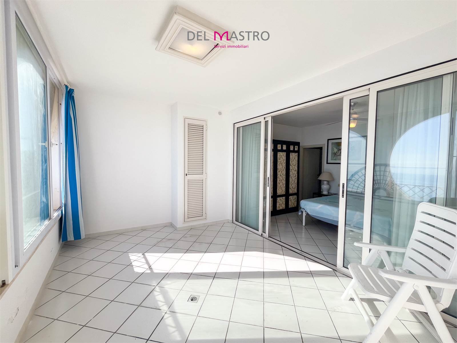 L’ingresso conduce alla zona giorno con cucina e living, valorizzata da un ampio terrazzo verandato con affaccio sul mare, perfetto da vivere in ogni stagione.